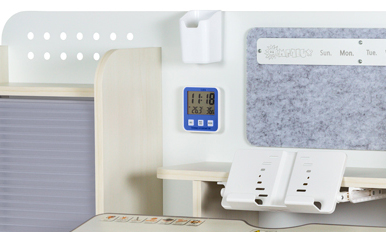 Часы-гигрометр с функцией измерения температуры и влажности в детской комнате. Кроме того, возможно установить будильник. Часы закреплены на металлическую стенку полки. Передняя панель доступна в голубом и розовом цвете, и прекрасно гармонирует со сменным декором парты.