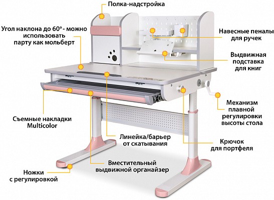 Одной из важных особенностей данной модели является наличие цветных накладок в подарок! Приобретайте полную комплектацию стола в сером цвете и получите розовые либо голубые накладки совершенно бесплатно! Накладки меняются на ножках, выдвижном органайзере и полке надстройке.