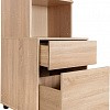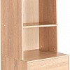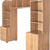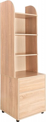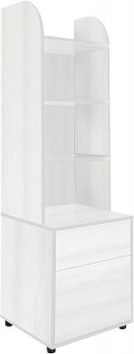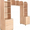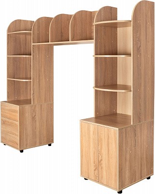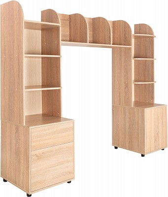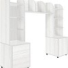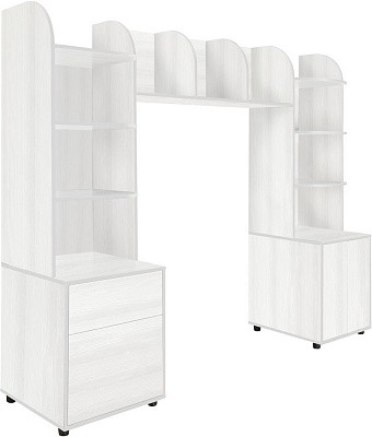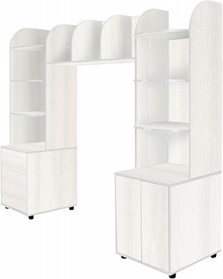 Комплект состоит из двух стеллажей с закругленными полками и двух вместительных тумб. Одна из тумб с ящиками, вторая - с распашными дверцами. Ящики и дверцы открываются простым нажатием на них. Навесная полка крепится между стеллажей. Комплект отлично впишется в интерьер любой комнаты, не только детской. Школьные принадлежности, канцелярия и аксессуары разместятся внутри ящиков.